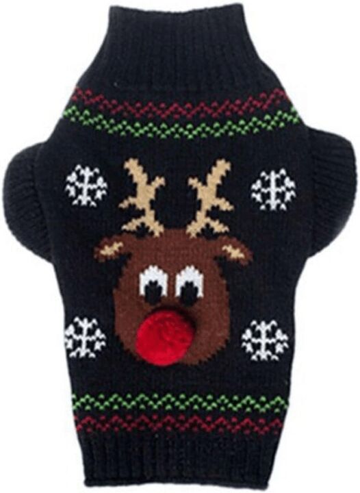 Simpático sweater con diseño de Reno, confeccionado con lana. Talle L: cuello 24 cm y se estira hasta 42 cm, pecho 40 cm y se estira hasta 48 cm. La medida corresponde al largo del lomo (se mide desde donde va el collar hasta el comienzo de la cola).