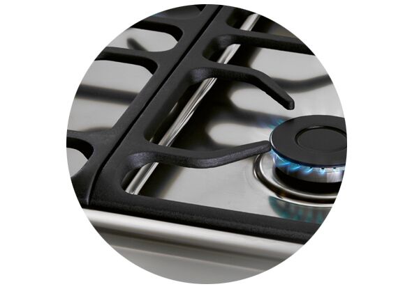 Acero inoxidable de 60 cm. encastrable con encendido electrónico a una mano, rejas de hierro fundido y ranuras de ventilación para horno a gas instalado bajo-mesada.