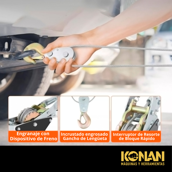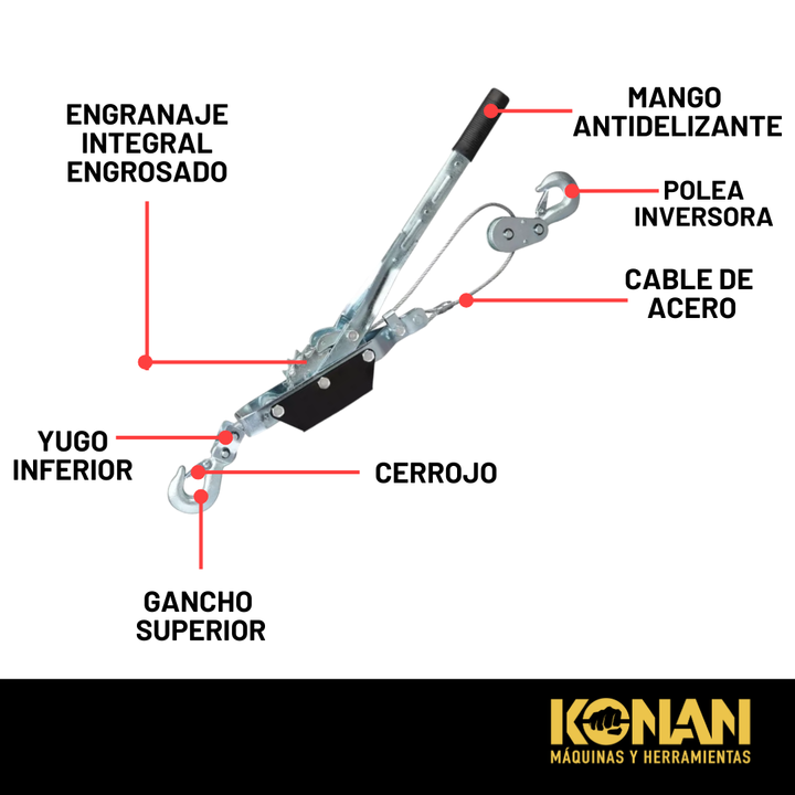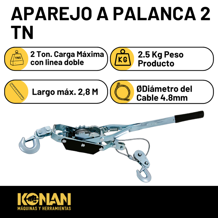 El Aparejo a Palanca Konan de 2 toneladas es una herramienta manual de izaje diseñada para elevar, bajar, tensar o estirar cargas pesadas con facilidad y seguridad, sin necesidad de energía eléctrica. Ideal para talleres, construcción, mantenimiento industrial, obras y aplicaciones agrícolas, este a...