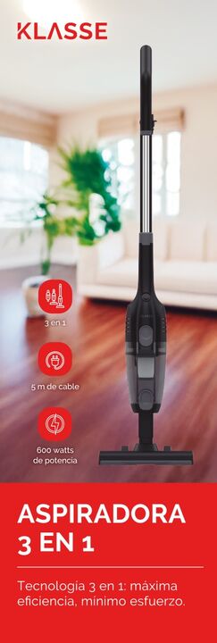 Mantené tu casa siempre limpia con la Aspiradora 3 en 1 KLASSE, diseñada para brindarte máxima eficiencia con mínimo esfuerzo. Su diseño práctico y liviano permite usarla como aspiradora de piso, de mano o para rincones, adaptándose a todas tus necesidades.Cable de 5 metros: Mayor alcance sin necesi...