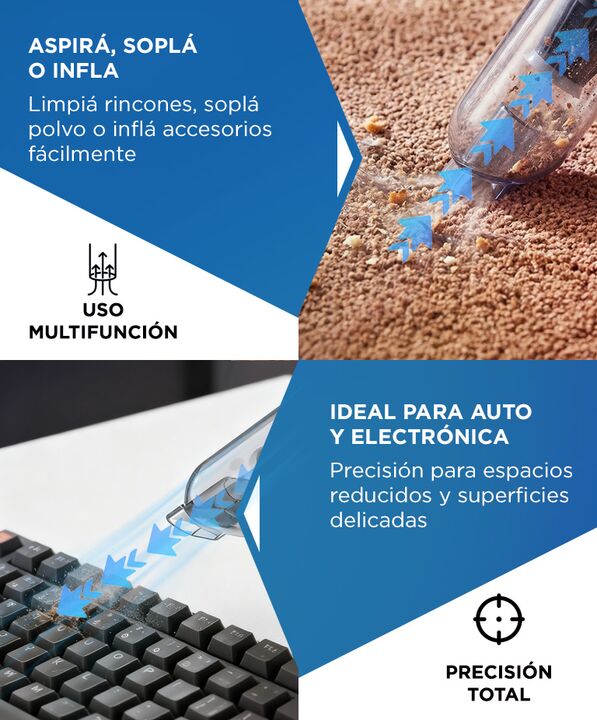 LIMPIEZA MULTIFUNCION Esta aspiradora de mano permite aspirar soplar e inflar con un solo equipo compacto Es adecuada para limpieza de interiores equipos electronicos y superficies delicadas La combinacion de funciones reduce la necesidad de multiples herramientas Una solucion practica para tareas d...