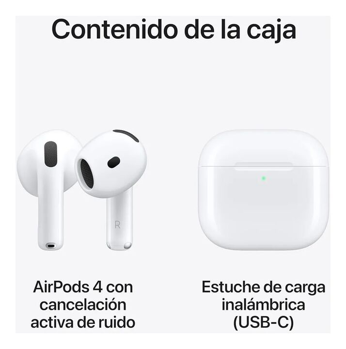 AirPods 4 con Cancelación Activa de Ruido: ofrecen una experiencia de audio completamente transformada con Audio Adaptativo y modo Transparencia, además de un ajuste actualizado para mayor comodidad durante todo el día. Contenido de la Caja AirPods 4 con Cancelación Activa de Ruido Estuche de Carga ...