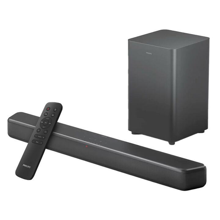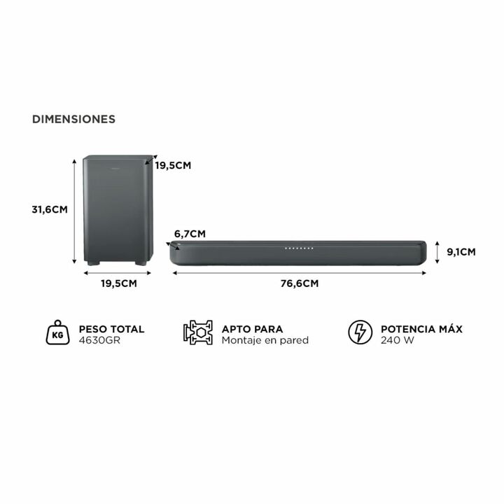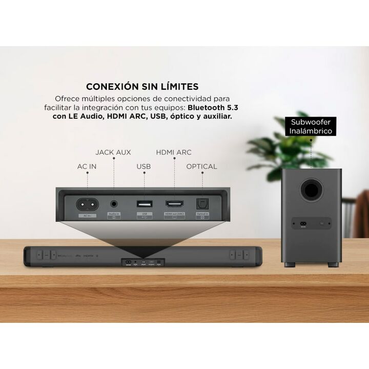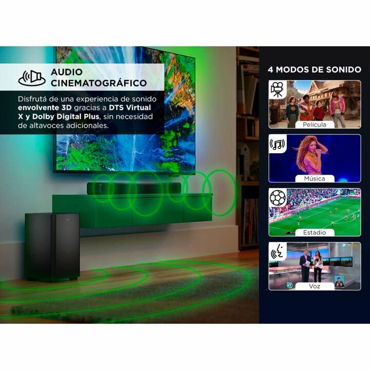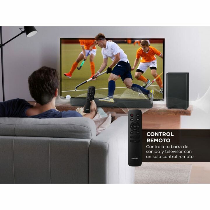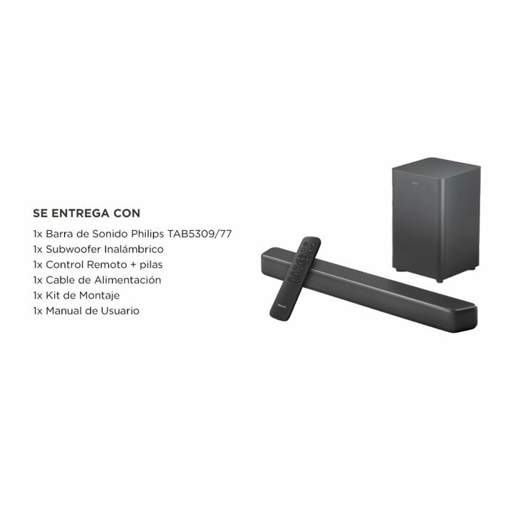 SONIDO ENVOLVENTE QUE TRANSFORMA TU ESPACIO: La Philips TAB5309/77 convierte cualquier ambiente en una verdadera sala de cine. Gracias a su potencia máxima de 240?W y su subwoofer inalámbrico, cada nota y efecto se percibe con fuerza e intensidad. La combinación de las tecnologías Dolby Digital Plus...