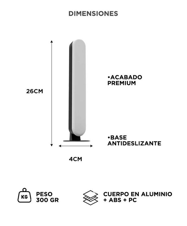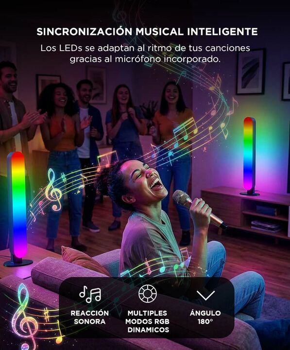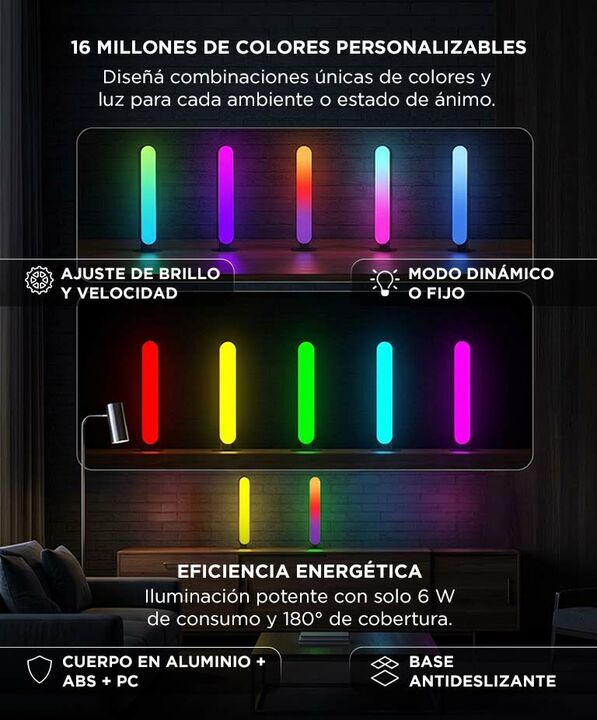 ILUMINACION DINAMICA RGBIC La barra LED Gadnic DESKL025 integra tecnologia RGBIC con 28 LEDs independientes. Esto permite generar efectos multicolor simultaneos y transiciones mas fluidas. El sistema pickup light capta el ritmo del entorno y sincroniza la iluminacion con la musica. Es ideal para cre...
