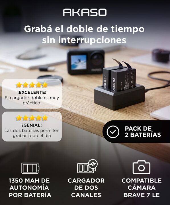 Autonomía extendida para grabaciones prolongadas: El kit de batería para cámara de acción AKASO Brave 7 LE incluye dos baterías recargables de 1350 mAh que permiten grabar durante más tiempo sin interrupciones. Resulta ideal para viajes, deportes extremos o grabaciones largas donde la autonomía es c...