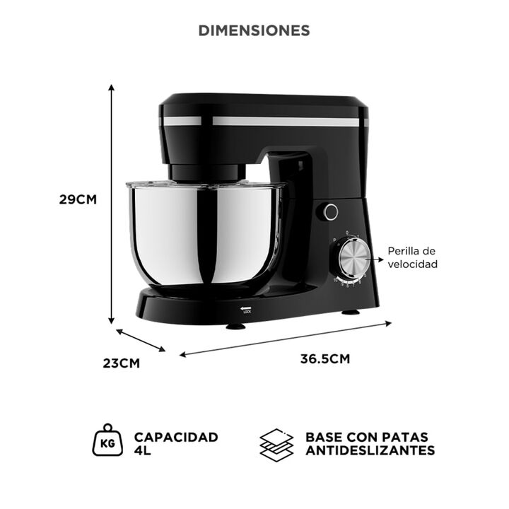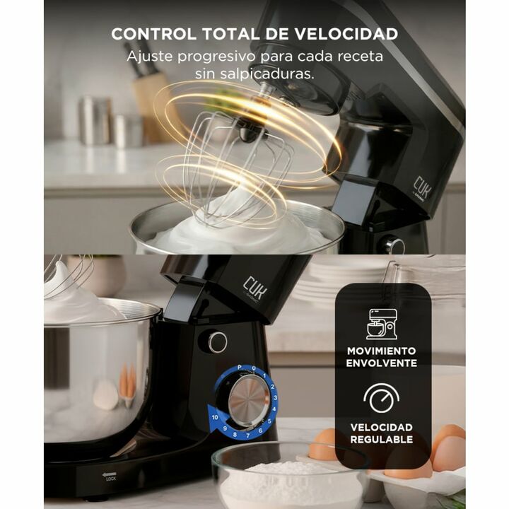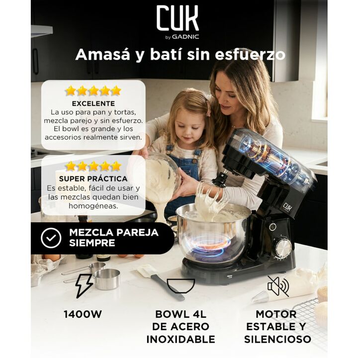 Batido planetario para mezclas parejas: La Batidora Planetaria CUK by Gadnic BATI019N utiliza movimiento planetario que recorre todo el bowl, logrando mezclas homogéneas sin zonas secas. Ideal para masas, cremas y batidos consistentes. Bowl de 4 litros en acero inoxidable: Permite preparar mayor can...