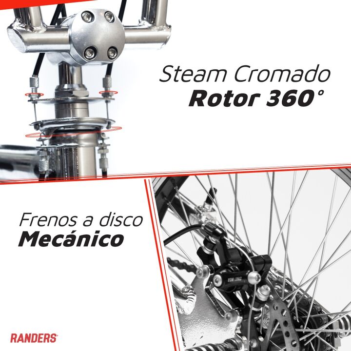Modelo: BMX Freestyle Cuadro: Aluminio cromado, durable y liviano Rodado: 20 con llantas de aluminio de doble pared con rayos cromados Frenos a disco mecánico Sten cromado con rotor 360 Pedales de acero Pedalines traseros y delanteros Taza de centro sellada Codo de aluminio. Asiento BMX con poste de...