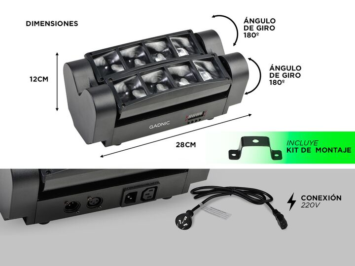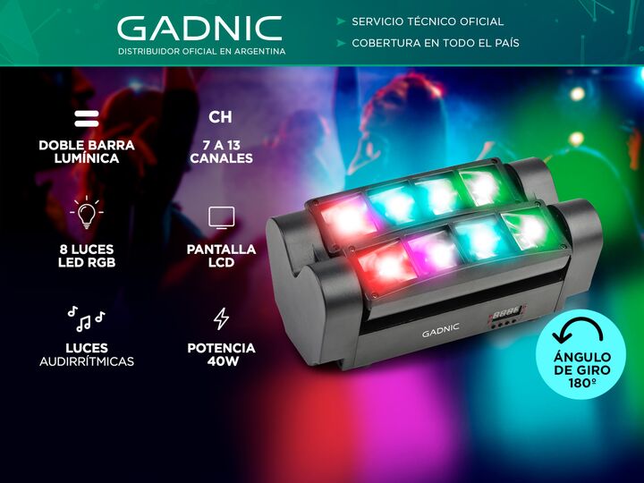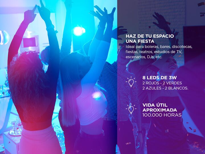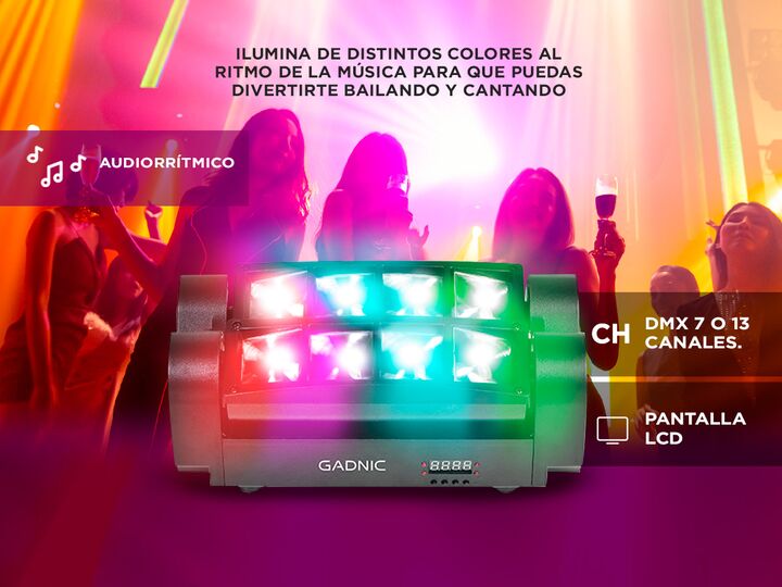 Haz de tu espacio una fiesta con el nuevo Cabezal Lumínico Gadnic. Ideal para boleras, bares, discotecas, fiestas, teatros, estudios de TV, escenarios, DJs, etc. Ilumina de distintos colores al ritmo de la música para que puedas divertirte bailando y cantando. Especificaciones Color de luz: RGB, bla...