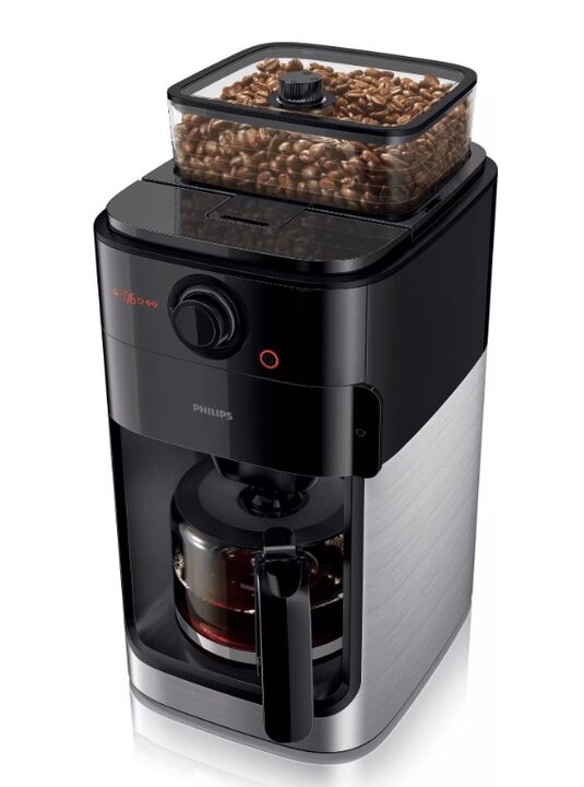 Disfruta de un gran caf a partir de granos de caf recin molidos con la cafetera Philips Grind Brew con molinillo integrado. Ajusta la intensidad del caf con la funcin de seleccin de intensidad. Molinillo de caf integrado-Con jarra de cristal-Negro y metal