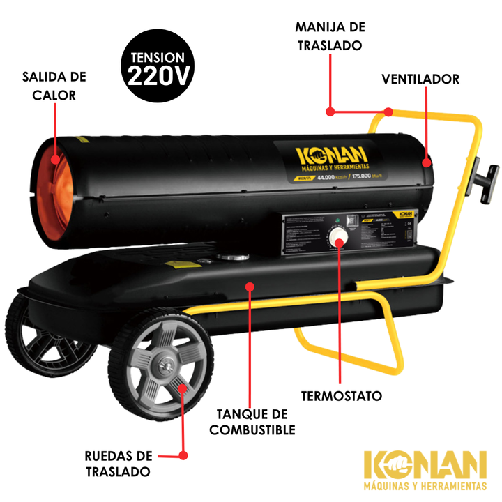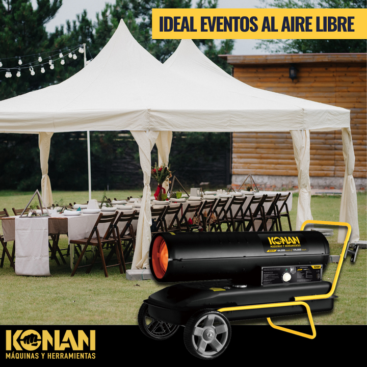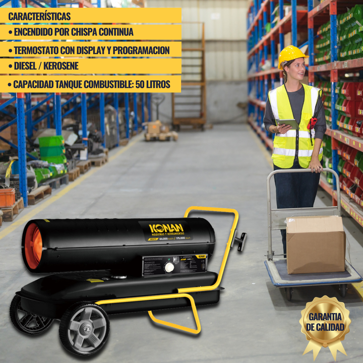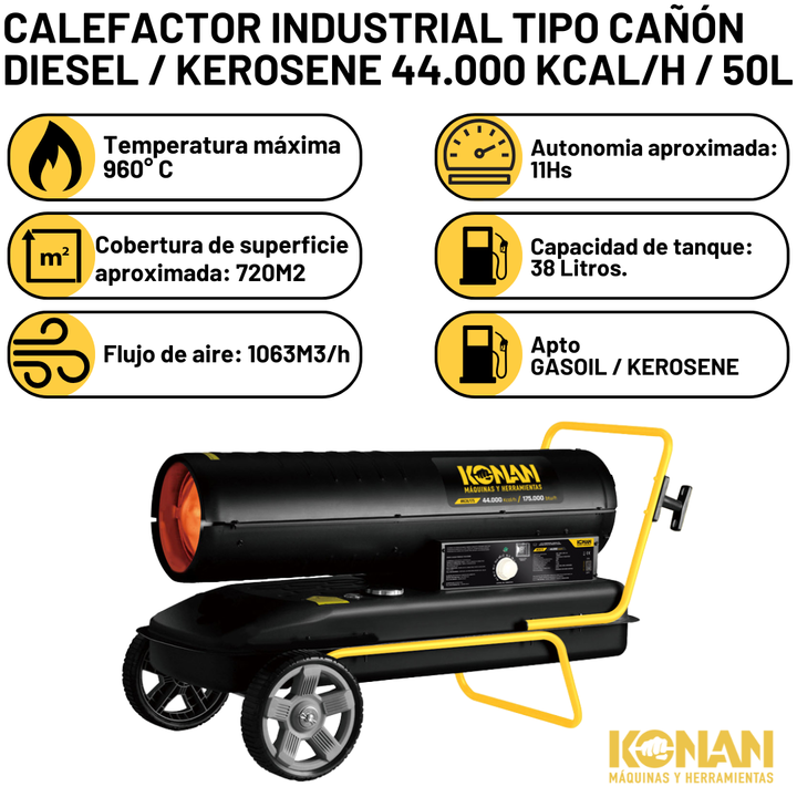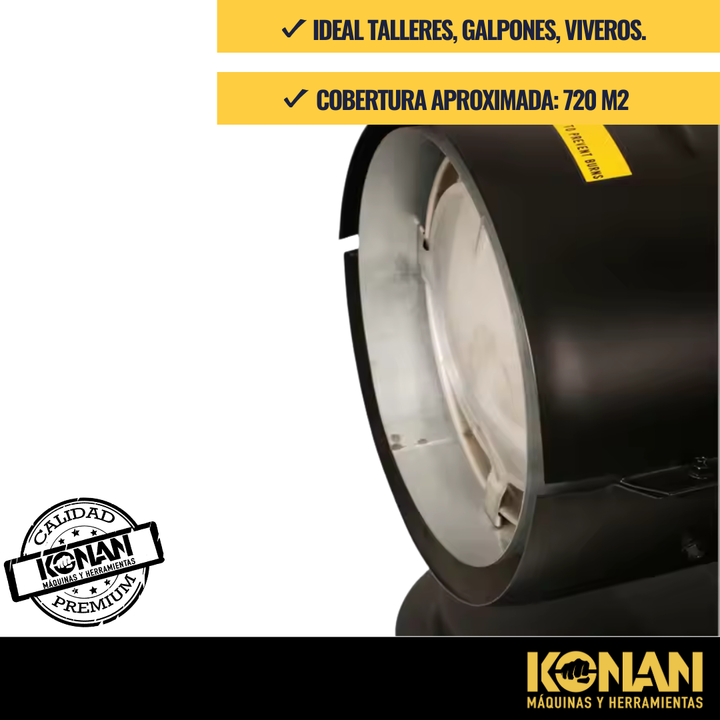 El calefactor cañón Konan Industrial Diesel Kerosene KCK175 es la solución ideal para ambientes industriales y espacios amplios donde se requiere una calefacción eficiente y potente. Con una impresionante potencia máxima de 44000 K/cal, este calefactor es capaz de abarcar grandes áreas, brindando u...