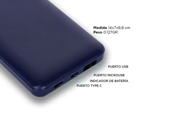 Alta capacidad de bateria 10.000mAhLed Indicador de CargaCarga Rapida1 Puerto USB1 Puerto TYPE C unicamente para cargar el powerbank1 Puerto MICRO USBCompatiblidad con cualquier dispositivo movil tablet camaras smartwatch.Dimensiones 14x98 cmEntrada 5v 1ABateria Li-PolimeroSalida 5v 2A