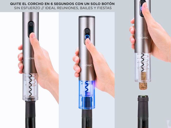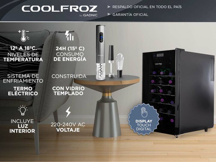Especificaciones Cava De Vino Coolfroz WCTE0018 18 Botellas Termoelectrica Display Led - CAVA0002 Medidas del Producto Ancho: 35 ------------------------------------------------------------------------------------------- Sacacorchos Automático Gadnic V-10 - VINO0001 Rápido y sin esfuerzo: 6 de desco...
