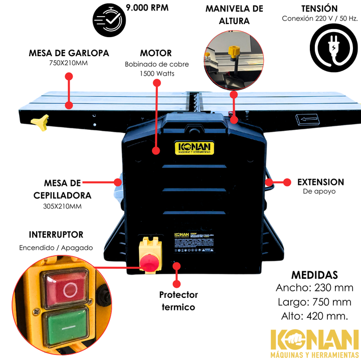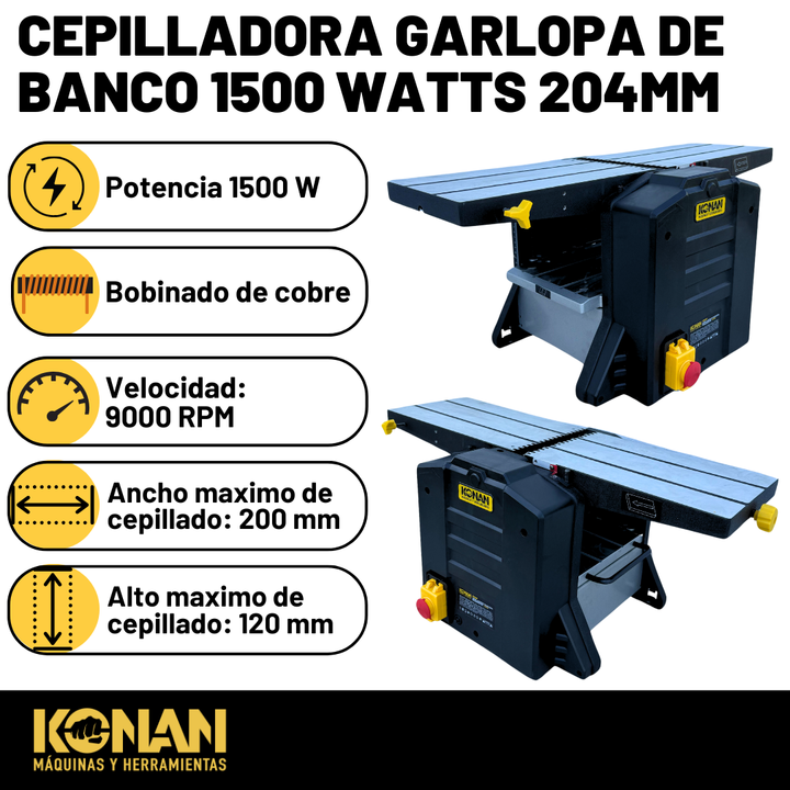Cepilladora Garlopa de Banco Konan – 1500 W · 204 mm