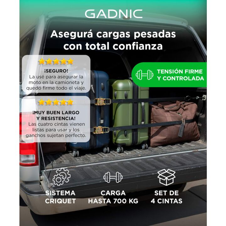Sujeción firme para cargas exigentes: La cinta de amarre Gadnic CINAM003 permite asegurar cargas durante el transporte con un ajuste estable y controlado. Resulta adecuada para motos, cuatriciclos y otros vehículos. Sistema criquet de alta tensión: Incorpora mecanismo criquet que aplica fuerza progr...