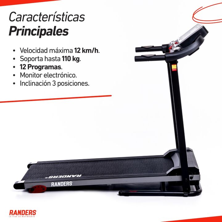 Peso máximo: 110 kg Motor: 1 HP Velocidad máxima: 12 km|h Superficie útil: 110x40 cm Programas: 12 Monitor: Tiempo, velocidad, distancia, calorías, pulso Inclinación manual (3 posiciones), plegable Peso del producto: 32 kg