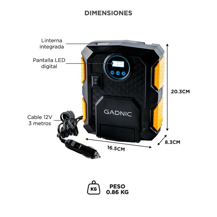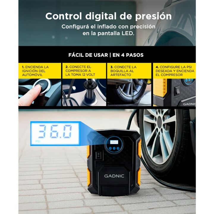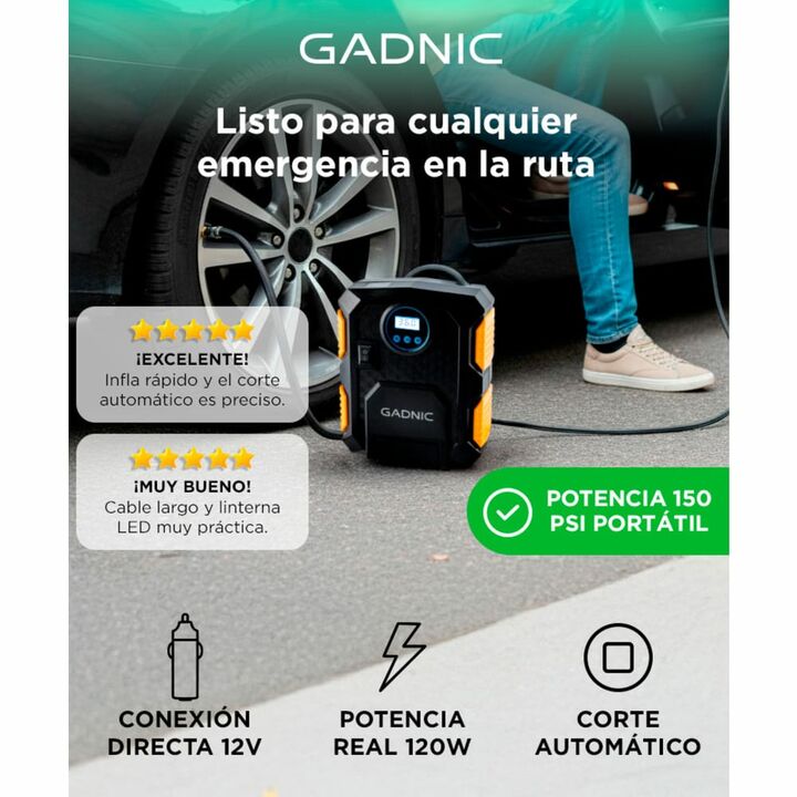 ¡Nuevo Compresor de Aire Gadnic! Portátil y compacto: lleve su compresor de aire Gadnic para automóvil con usted y esté listo para cualquier emergencia. El cable de alimentación de 4,27 Metros se almacena dentro de la pequeña unidad compacta, lo que hace que los compresores de aire sean el accesorio...
