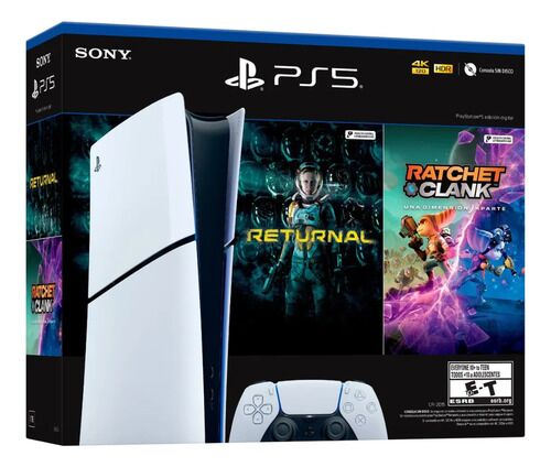 Incluye: Consola PlayStation 5 edición digital Control inalámbrico DualSense 2 pies de soporte horizontal Cable HDMI Cable de alimentación ca Cable USB Materiales impresos ASTROs PLAYROOM (juego preinstalado) Cupón de Returnal Cupón de Ratchet & Cnak: Una Dimensión Aparte