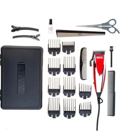 Cortadora con cable con palanca de ajuste de altura de corte. Kit completo de 20 piezas. Incluye 9 peinesguia que te permitiran encontrar el largo adecuado rapidamente. 3 peines accesorios. protector de cuchilla. tijera. aceite lubricante.cepillo de limpieza. 2 clips de cabello y practico estuche ri...
