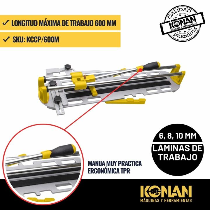 La Cortadora de Cerámica Konan KCCP/600M con maletín es una herramienta manual, práctica y de alto rendimiento, ideal para cortar cerámicos, azulejos y porcelanatos de hasta 600 mm de longitud de forma precisa y cómoda. Su diseño con maletín incor...