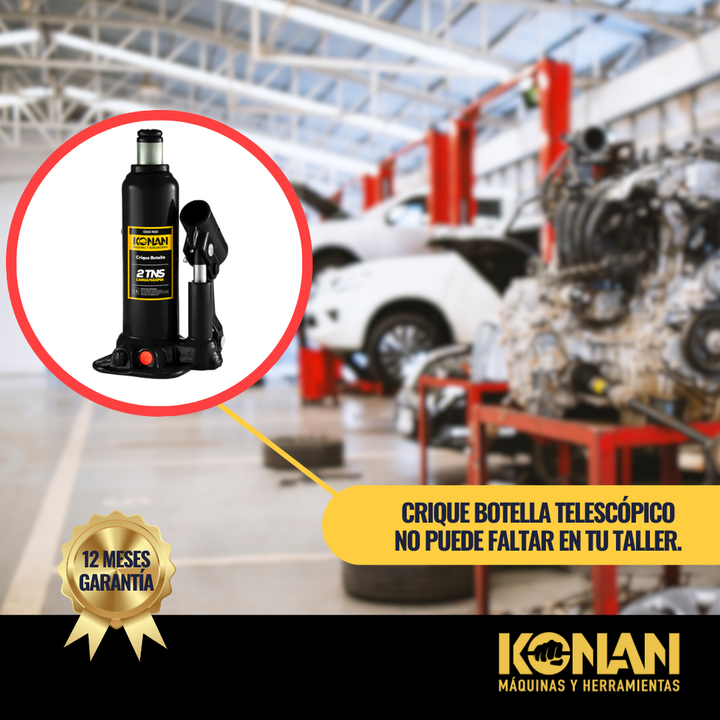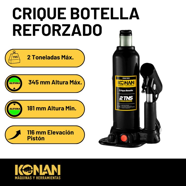 El Crique Botella Reforzado Konan de 2 toneladas es una herramienta hidráulica compacta, resistente y confiable, ideal para elevar cargas medianas con seguridad, precisión y facilidad de uso. Su diseño tipo “botella” permite aprovechar al máximo la fuerz...