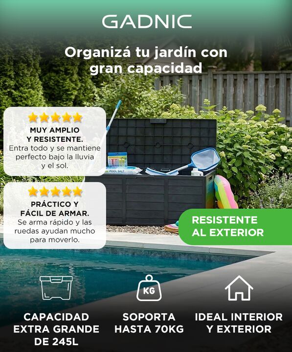 ALMACENAMIENTO AMPLIO Y FUNCIONAL Este deposito de jardin ofrece una capacidad de 245L ideal para organizar herramientas de trabajo accesorios y objetos de exterior. Su tamaño permite almacenar desde palas y mangueras hasta almohadones y juguetes de patio. El formato rectangular optimiza el espacio ...