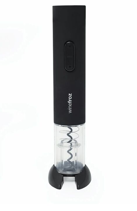 Cuerpo de caucho negro. Abre hasta 70 botellas. Cuerpo inferior transparente que permite ver el proceso. Utiliza 4 pilas AA no incluidas