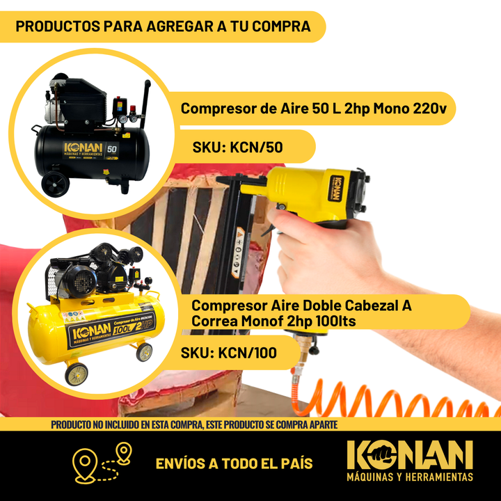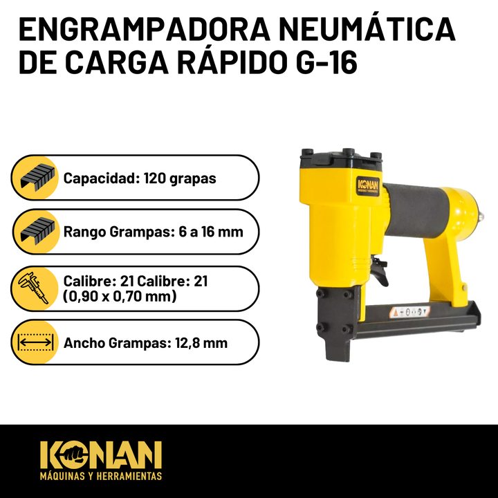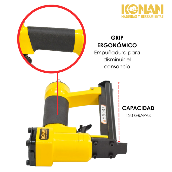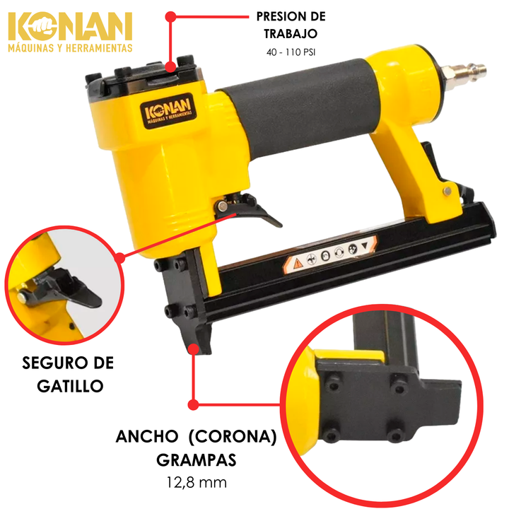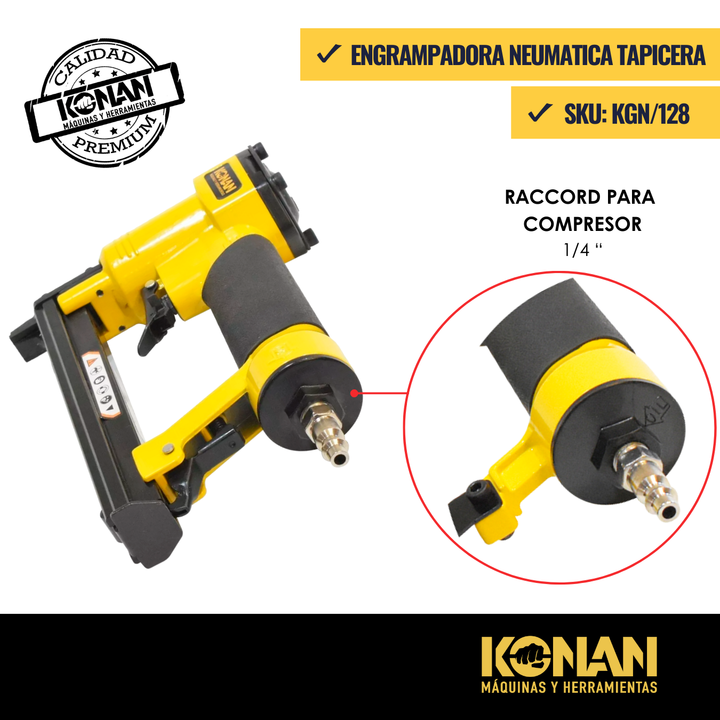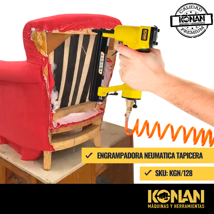 La Engrampadora Neumática Konan 12,8 Mm (modelo KGN/128) es una herramienta profesional diseñada para realizar fijaciones rápidas y precisas con grapas neumáticas, ideal para trabajos en carpintería, tapicería, construcción y bricolaje exigente.