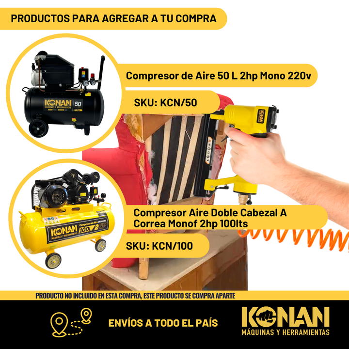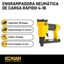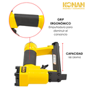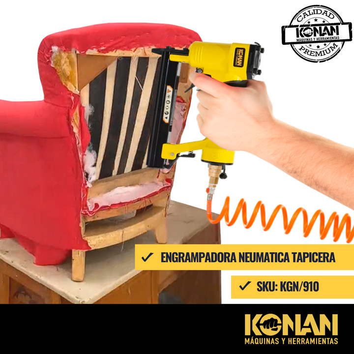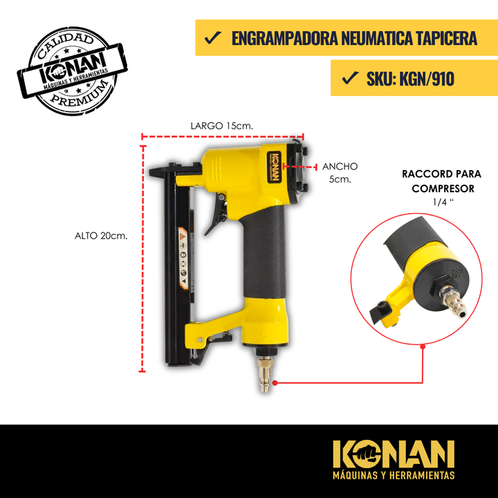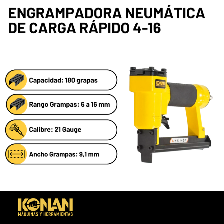 La Engrampadora Neumática Konan de Carga Rápida 4-16 mm (modelo KGN/910) es una herramienta neumática profesional diseñada para fijar grapas de manera rápida, precisa y eficiente. Utiliza aire comprimido (de un compresor) para disparar grapas d...