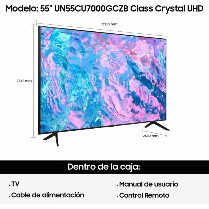 Disfruta de una experiencia visual excepcional con el Eq Tv Smart 55 Uhd Serie Cu7000 de Samsung. Con una pantalla LED de 55 y una resolución máxima de 3840x2160 px, podrás sumergirte en tus contenidos favoritos con una calidad de imagen impresionante. Además, cuenta con 3 puertos HDMI y 1 puerto US...