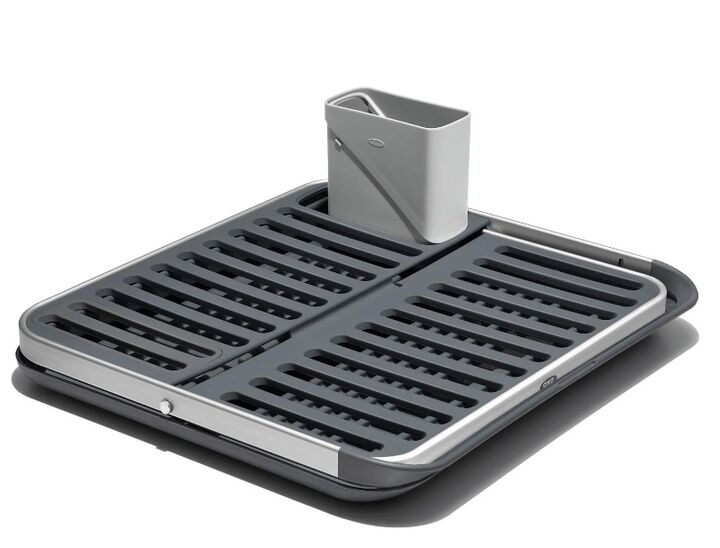El marco de aluminio inoxidable tiene un diseo de dos capas que sostiene articulos de todos los tamaos y se puede personalizar con un recipiente extraible para utensilios que se puede colocar a ambos lados del estante. brSe pliega completamente plano- lo que lo hace ideal para usar como tabla de sec...