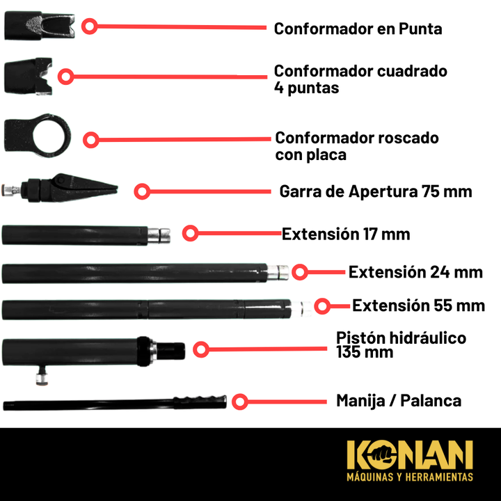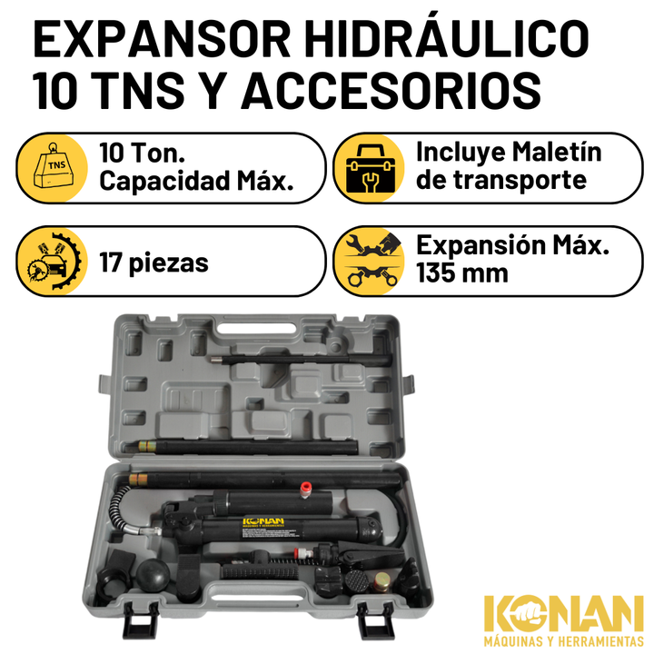 La Expansor Hidráulico Chapista 10 Ton Konan es una herramienta profesional e indispensable en talleres de chapa y pintura para realizar trabajos que requieren fuerza hidráulica controlada, como empujar, jalar, separar, expandir o enderezar piezas metálic...