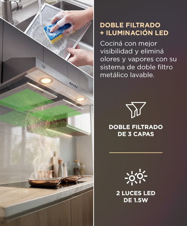 Potencia real de extracción 250 m³/h: El extractor CUK by Gadnic EXT55100 elimina humo, grasa y olores con flujo de aire de 250 m³/h, ideal para cocinas domésticas medianas. Doble sistema de filtrado eficiente: Incluye 2 filtros de aluminio de 3 capas lavables y filtro de carbón para uso con o sin s...