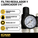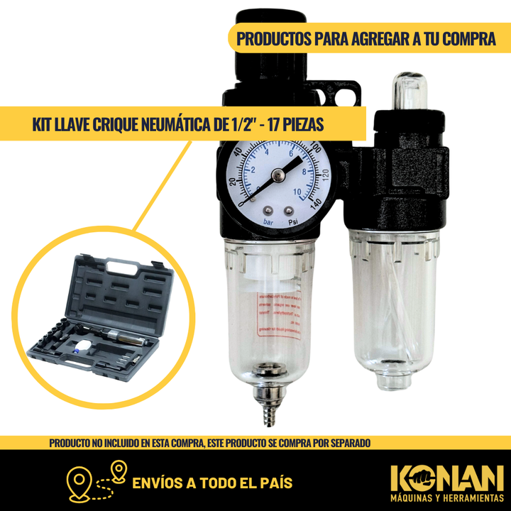 El Filtro de Aire para Compresor con Regulador y Lubricador Konan KAF/02 es un equipo 3 en 1 indispensable para sistemas de aire comprimido, diseñado para proteger y optimizar el funcionamiento de herramientas neumáticas. Ideal para ta...