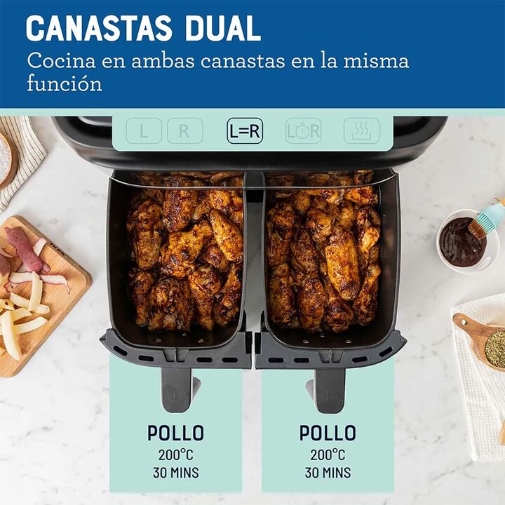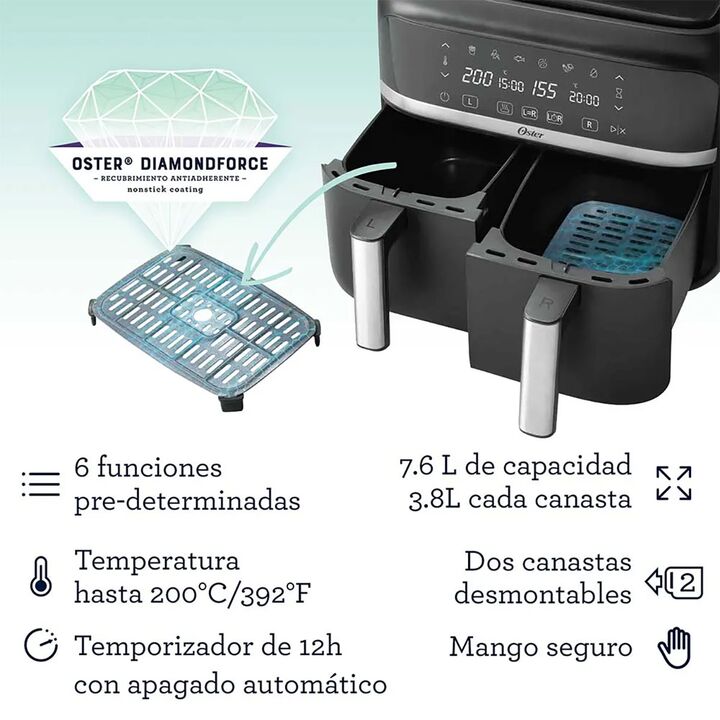 FREIDORA DE AIRE DUAL OSTER CON RECUBRIMIENTO DIAMONDFORCE La Freidora de aire dual Oster con recubrimiento DiamondForce 12 veces más duradero y resistente a rayaduras es una freidora con dos canastas que te permite cocinar dos platos independientes al mismo tiempo. Tiene una capacidad grande de 7,6...