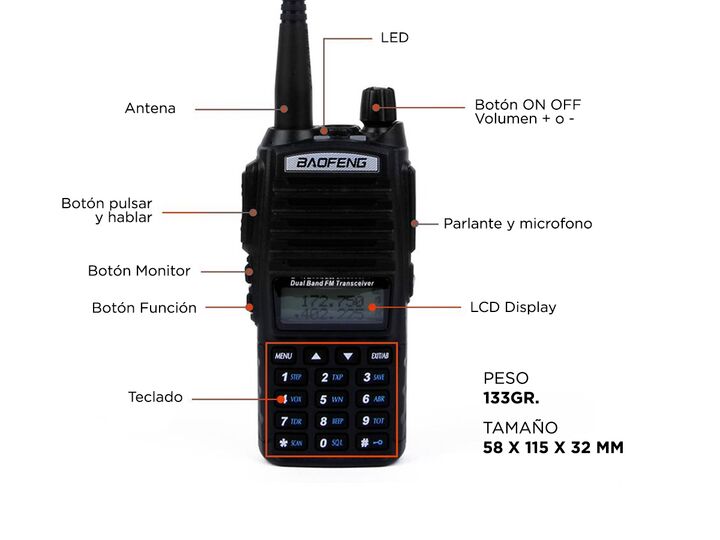 El Handy Baofeng es un transmisor-receptor portátil de doble banda que incorpora una pantalla LCD para la visualización del menú. Con una potencia de 10W, ofrece un rendimiento sólido y confiable. Opera en modo de frecuencia y modo de canal, e incluye la funcionalidad de codificación DTMF para una m...