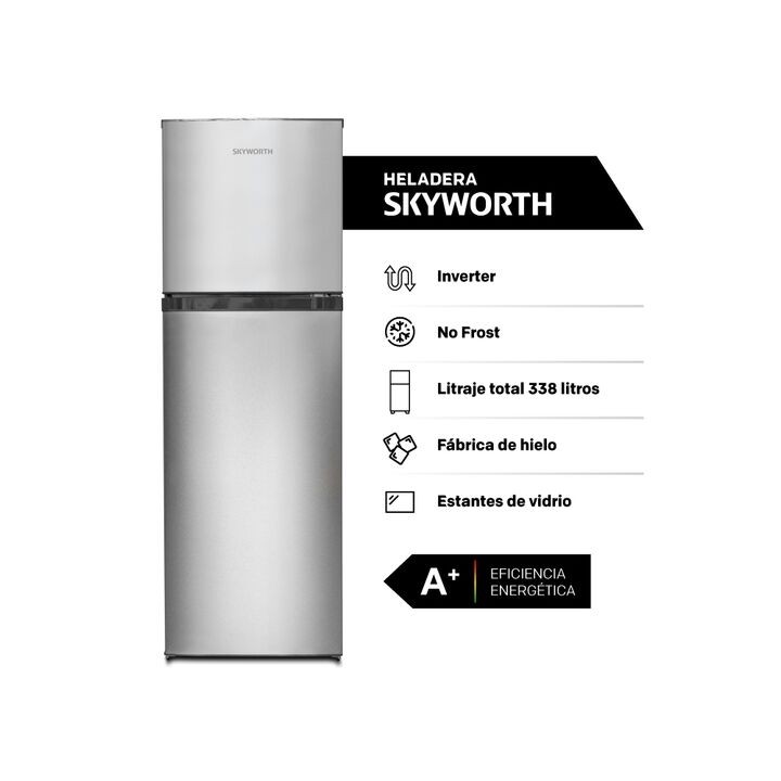 La Heladera Freezer Skyworth 326L combina tecnología de vanguardia con una capacidad amplia para satisfacer todas tus necesidades de almacenamiento. Con motor Inverter y tecnología No-Frost, garantiza un funcionamiento eficiente y sin escarcha, manteniendo los alimentos frescos por más tiempo. Su fo...