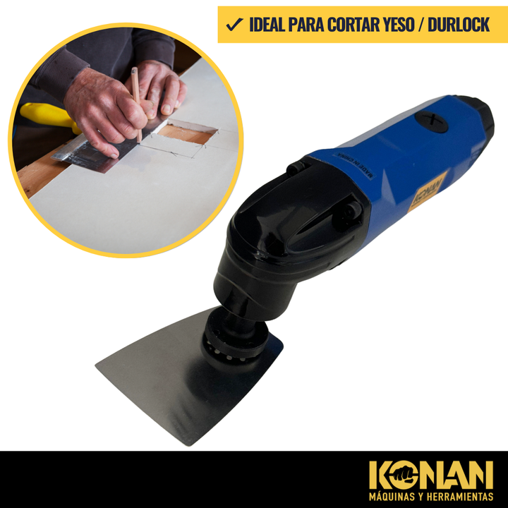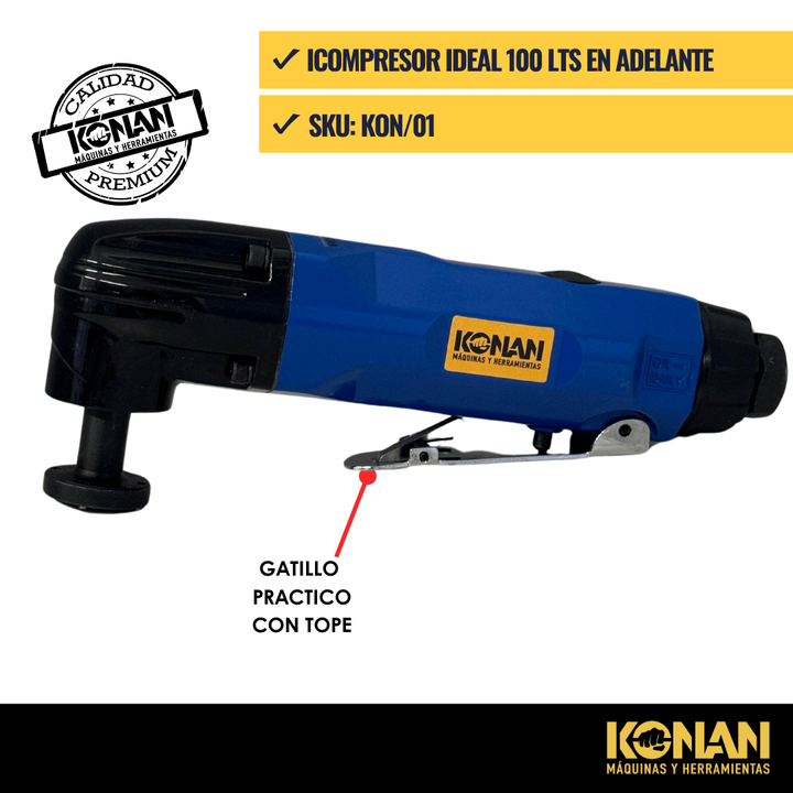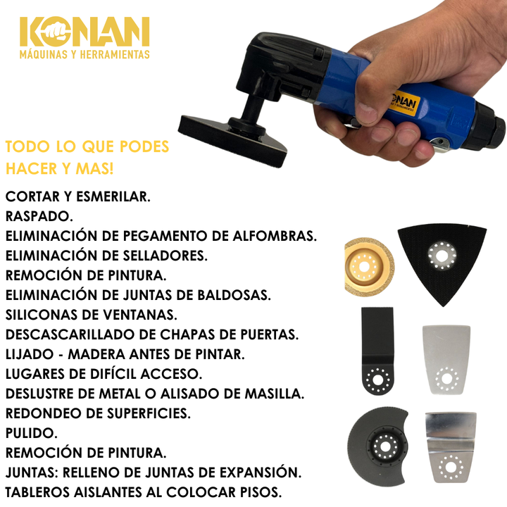 La multiherramienta neumática KONAN es una herramienta que utiliza aire comprimido para accionar una variedad de accesorios intercambiables, lo que la convierte en una herramienta extremadamente versátil para una amplia gama de tareas.