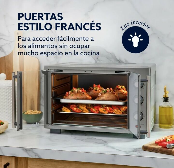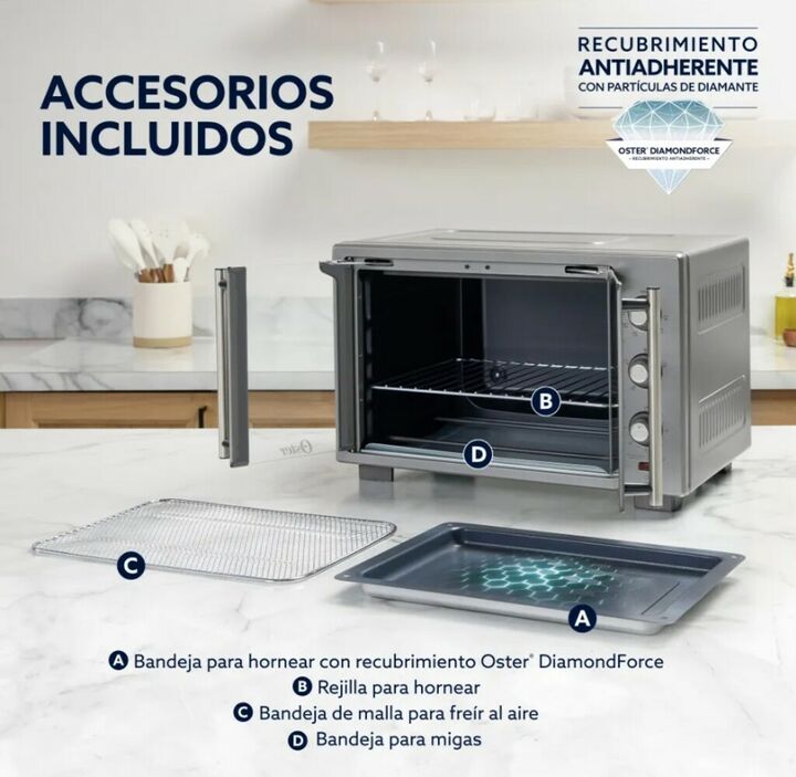 Cocinar en casa se vuelve más práctico con un horno versátil y fácil de limpiar. El Horno con Freidora de Aire Oster de 35 L tiene un interior antiadherente que evita que los alimentos se peguen, haciendo la limpieza mucho más sencilla. Ofrece 5 maneras de cocinar: freír al aire, hornear, asar, tost...