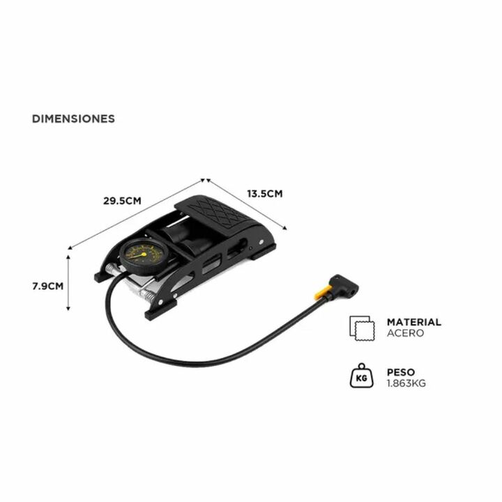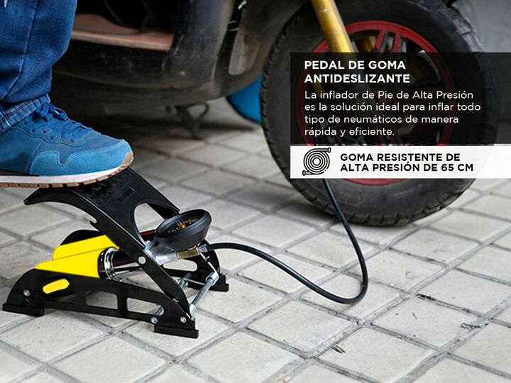 La inflador de Pie de Alta Presión es la solución ideal para inflar todo tipo de neumáticos de manera rápida y eficiente. Con su sistema de doble cilindro y manómetro de fácil lectura, garantiza un inflado preciso y sin esfuerzo. Fabricada con materiales resistentes como el aluminio y acero, y equip...