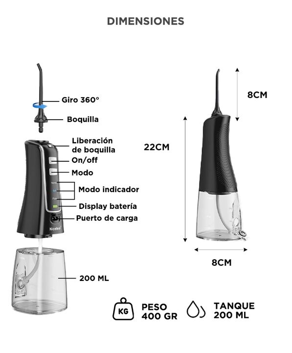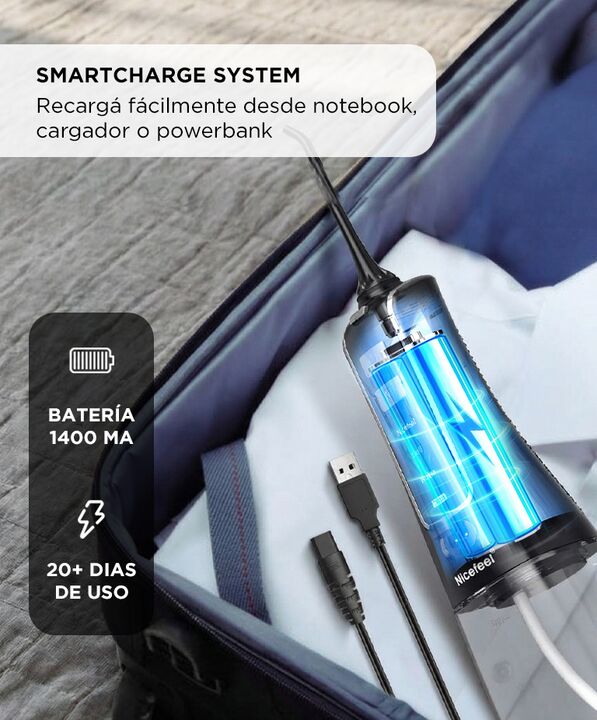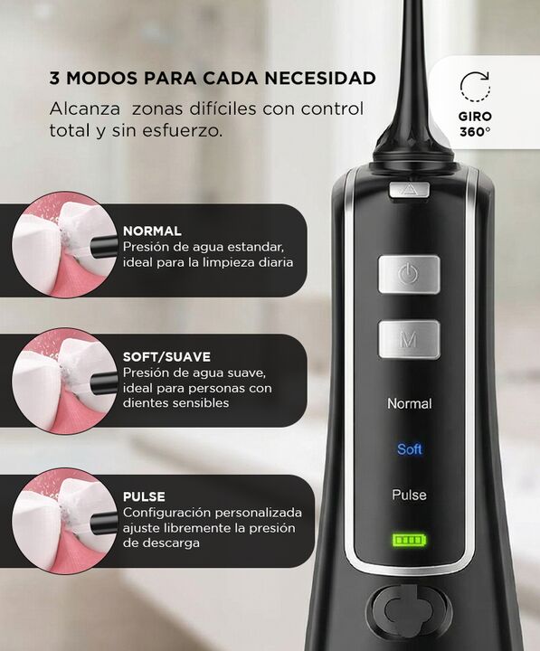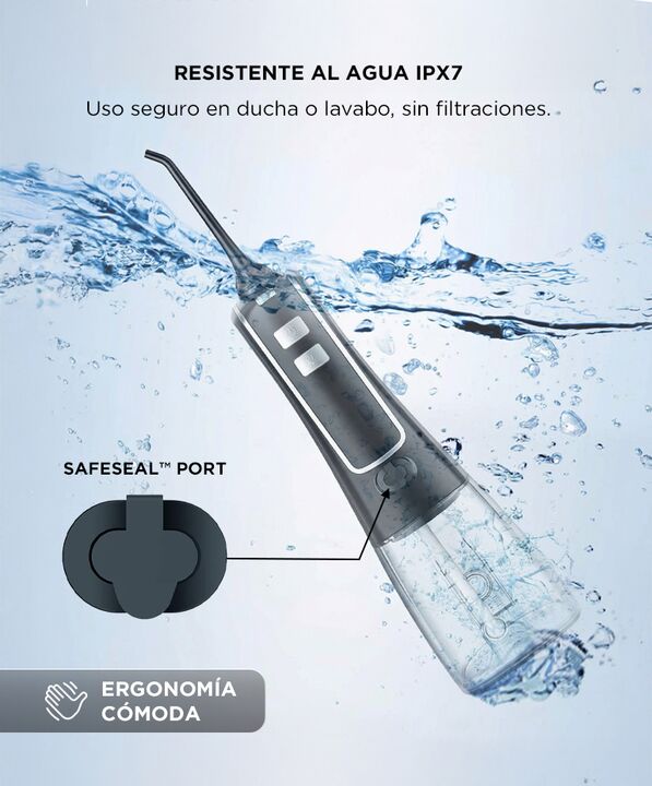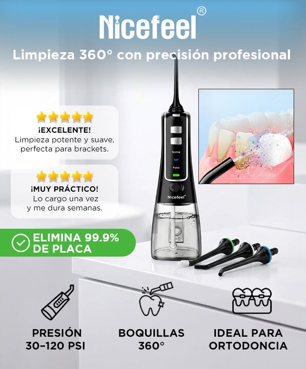 LIMPIEZA PROFUNDA Y PRECISA El irrigador bucal Nicefeel FC256 genera hasta 1800 pulsos por minuto para remover restos de alimentos y placa acumulada. Su potencia permite acceder a espacios interdentales y zonas de dificil alcance. Las boquillas giratorias de 360 grados mejoran la cobertura. Es una h...