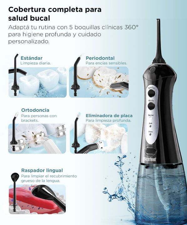 LIMPIEZA PROFUNDA CON MICRO BURBUJAS El irrigador bucal Nicefeel NF A1 utiliza tecnologia de flujo de agua con micro burbujas. Estas penetran suavemente entre dientes y encias. Permiten una limpieza profunda sin generar molestia. Es una alternativa eficaz al hilo dental tradicional. MODOS AJUSTABLES...