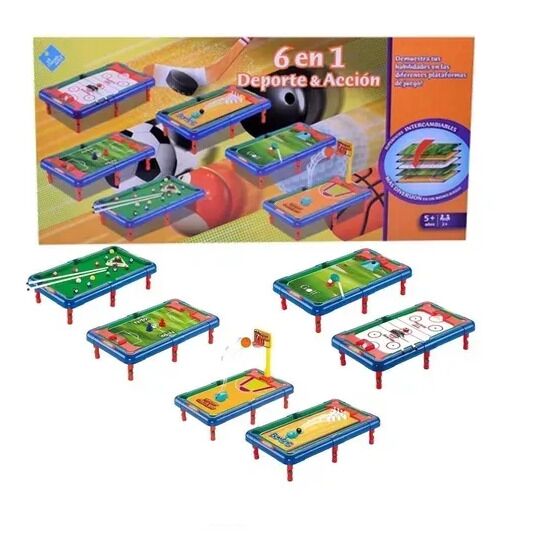 Con el nuevo set 6 en 1 de deportes de El Duende Azul tendrs horas de diversin aseguradas Tendrs 6 superficies intercambiables bowling tejo bsquet pool hockey y golf Usa tus habilidades para dominar las diferentes plataformas de juego Divertite con tus amigos o en familiaNo te lo pierdasContenido5 P...