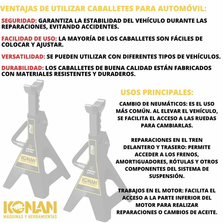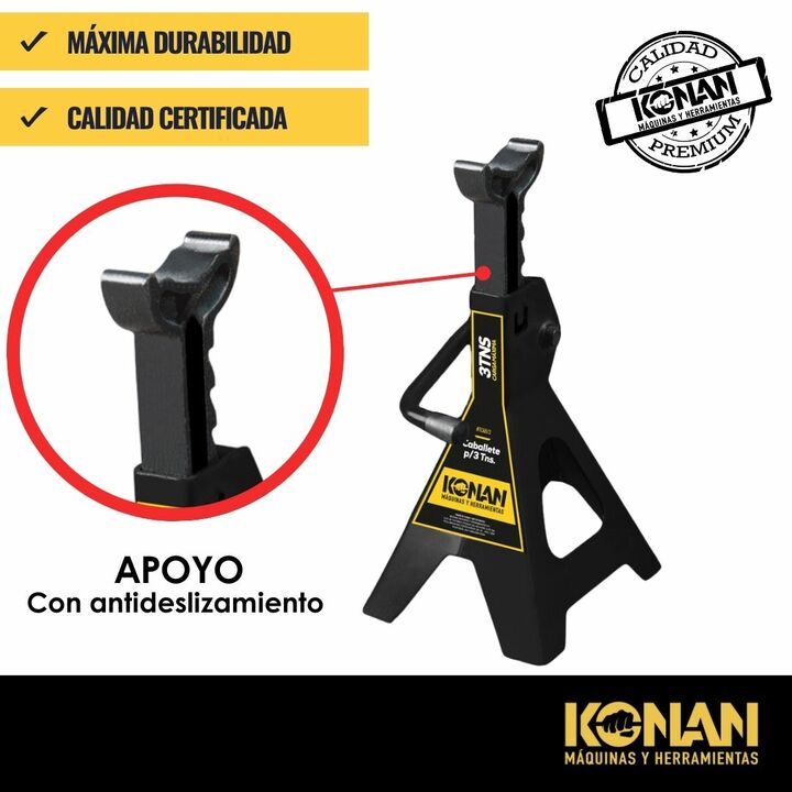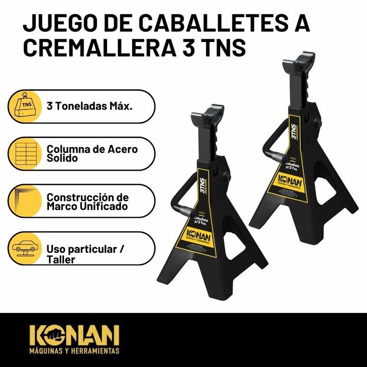 El Juego de Caballetes a Cremallera Konan de 3 toneladas es un set de soportes robustos y confiables diseñado para sostener cargas elevadas de manera estable y segura. Ideales para talleres, garages, mantenimiento automotriz y trabajos de elevación d...