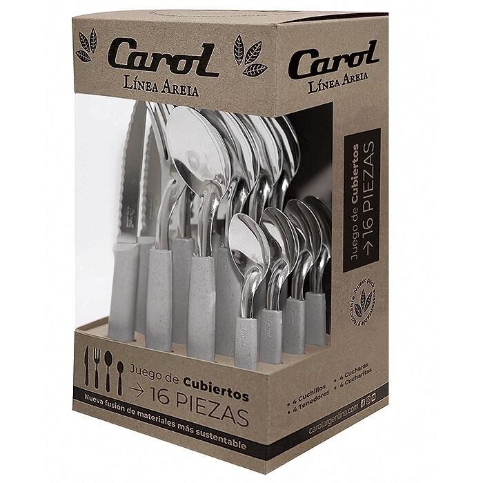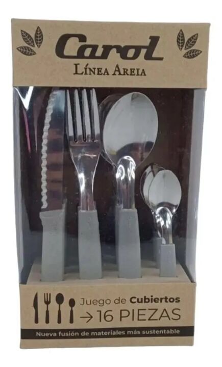 Incluye 4 cuchillos hoja serrucho 4 tenedores 4 cucharas soperas 4 cucharas para te- BeneficiosAcero inoxidableExcelente calidad y resistenciaMango plasticoFusion de materiales mas sustentableCaja sustentableApto lavavajillas