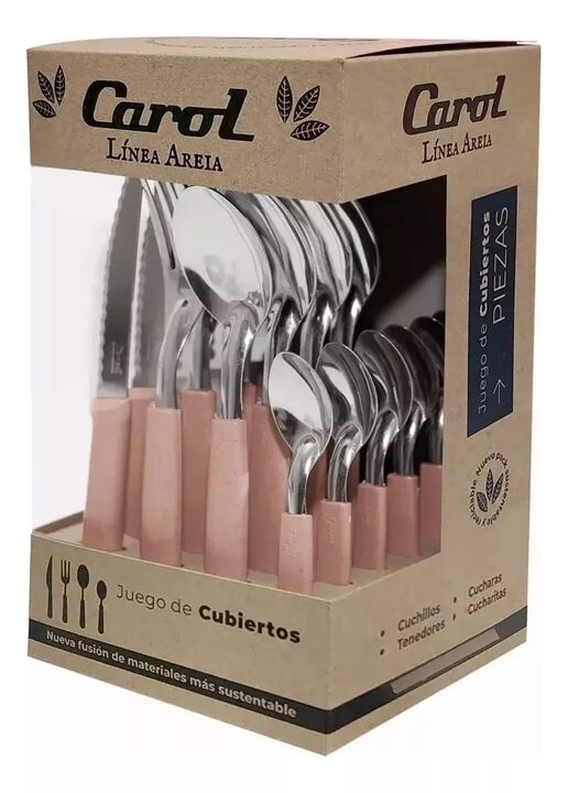 Incluye 4 cuchillos hoja serrucho 4 tenedores 4 cucharas soperas 4 cucharas para te- BeneficiosAcero inoxidableExcelente calidad y resistenciaMango plasticoFusion de materiales mas sustentableCaja sustentableApto lavavajillasIMAGEN ILUSTRATIVA