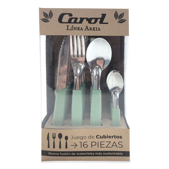 Incluye 4 cuchillos hoja serrucho 4 tenedores 4 cucharas soperas 4 cucharas para te- BeneficiosAcero inoxidableExcelente calidad y resistenciaMango plasticoFusion de materiales mas sustentableCaja sustentableApto lavavajillas