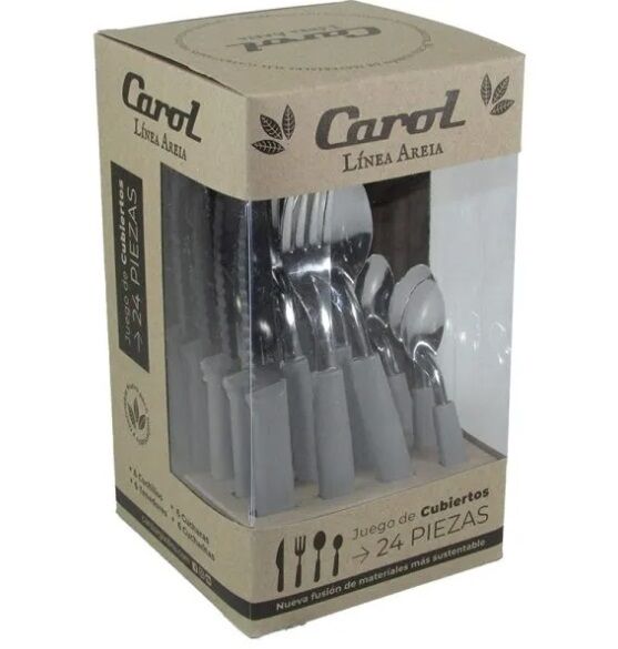 DESCRIPCIoN DEL PRODUCTO Set de 24 cubiertos a granel En caja Marca Carol Mango de plastico PVC de color Hoja de acero inoxidable de excelente calidad y resistencia Incluye 6 cuchillos hoja serrucho 6 tenedores 6 cucharas soperas 6 cucharas para te