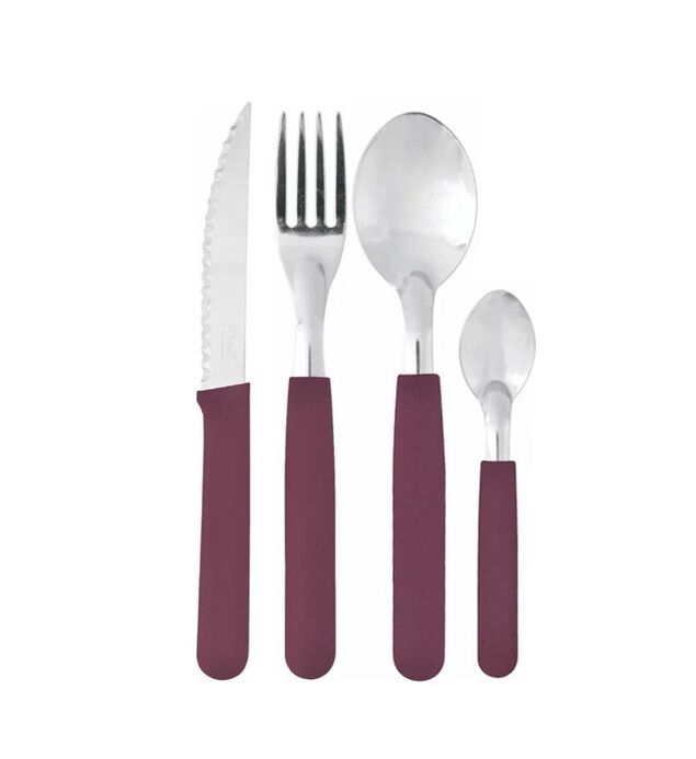 Incluye6 tenedores de acero inoxidable con mango plastico6 cucharas de acero inoxidable con mango plastico6 cuchillos filo laser de acero inoxidable con mango plastico6 cucharitas de te de acero inoxidable con mango plasticoFrasco de plastico