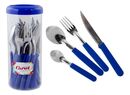 Incluye6 tenedores acero inoxidable con mango plastico6 cucharas acero inoxidable con mango plastico6 cuchillos acero inoxidable con mango plastico6 cucharitas acero inoxidable con mango plasticoFrasco de plastico