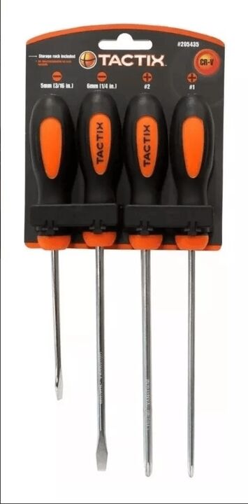 JUEGO 4 Destornilladores TACTIX 205435MedidasPlano 5mm x 100mmPlano 6mm x 150mmPhillips N1 x 150mmPhillips N2 x 150mmIncluye comodos organizadores para colgar